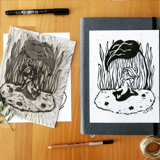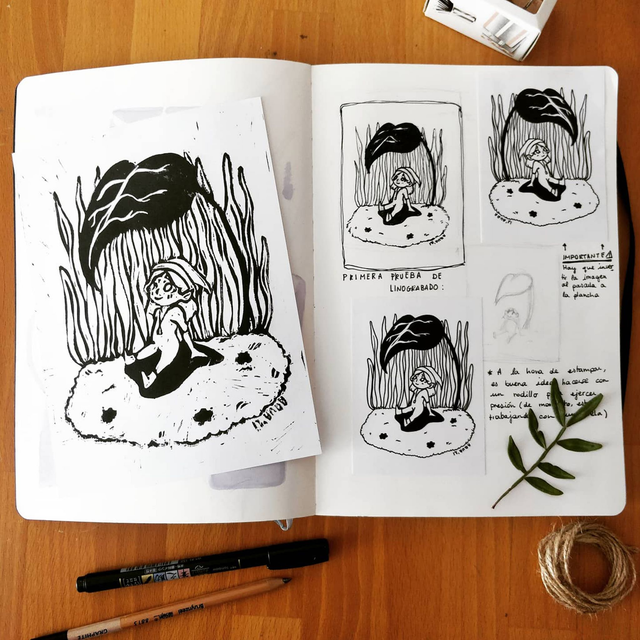 Estampado linocut hecho a mano en el que se ve a un duende disfrutando de la sombra de una hoja. Debido a la técnica de estampación puede haber distintas variaciones en la pintura, por lo que cada pieza es única. Las láminas están numeradas.
