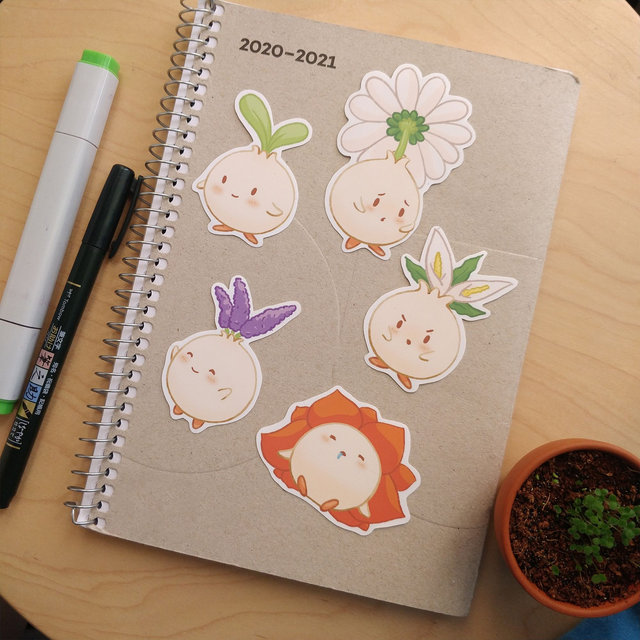Pack de 5 pegatinas de pequeños y adorables bulbos de plantas que tienen diferentes estados de ánimo impresas en papel mate resistente al agua hechas a mano.