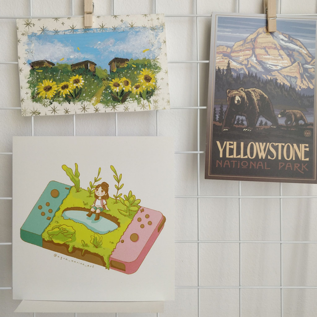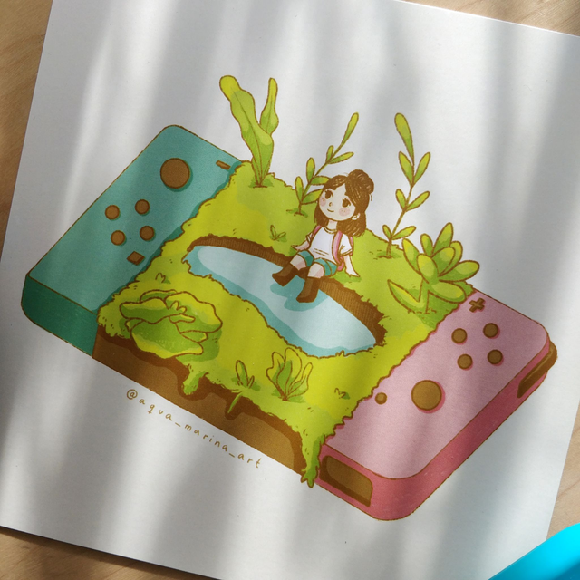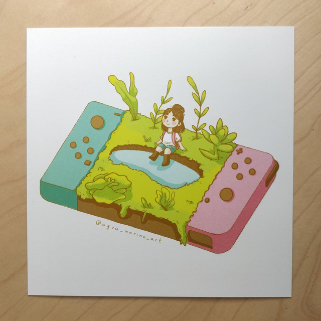Postal de momento de relax al jugar en tu pequeño mundo en la Nintendo Switch, impresa en papel de 300 gr.